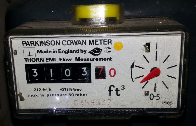The meter is quite old. A Parkinson Cowen / Thorn EMI meter. It says 1985 on the front, which I guess is the manufacture date. It has several numeric digits and a single dial. This is marked '0.071 ft3 per revolution'.