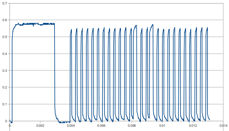 The tx pulse is driven with the NPN driver through a transformer, which seems to be driven with around 13 pulses of 40kHz. This produces a resonance in the transducer, seen here :